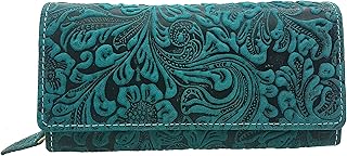 Leder Damen Hochformat Geldbörse / Geldbeutel / Portemonnaie / Portmonaise mit wunderschönem Lianen Muster in Hoch Tief Prägung mit Außenriegel mit RFID & NFC Schutz inkl. Nähset (Petrol)
